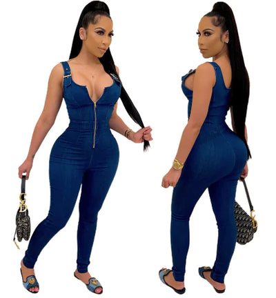 Women's Stretch Denim Jumpsuit with Spaghetti Straps (One Piece)