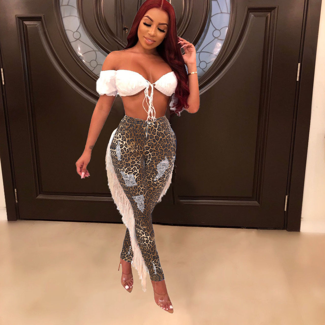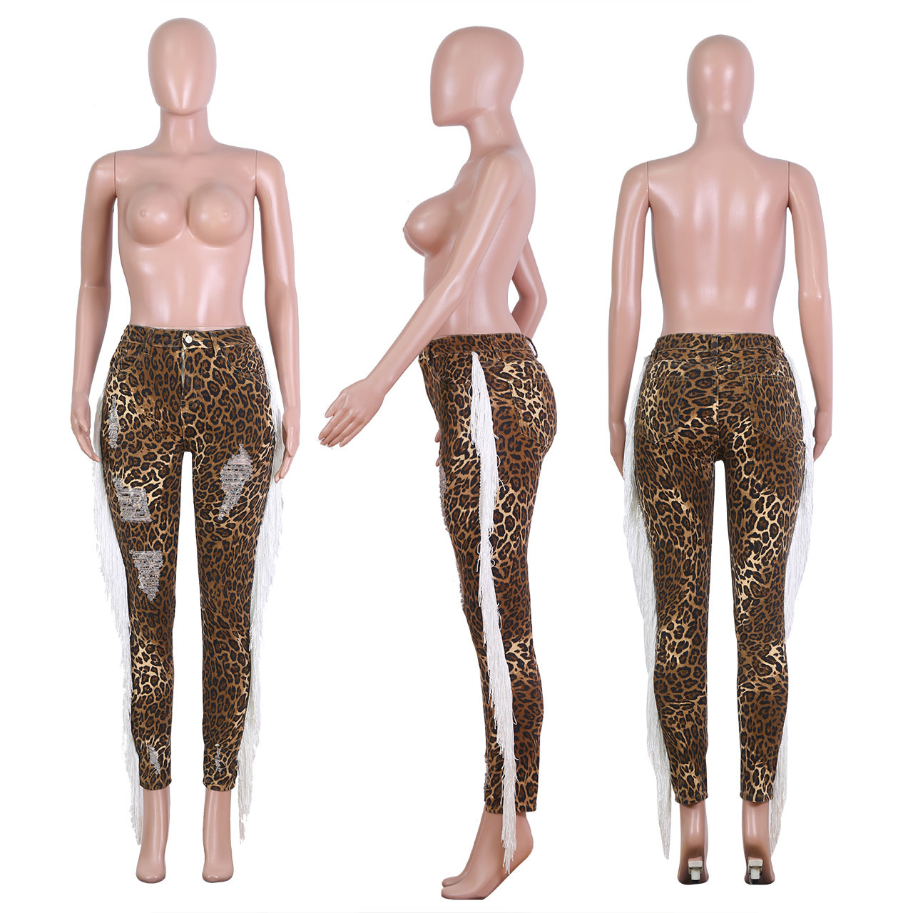 The unique leopard print pattern is perfect for making a bold statement, while the stylish fringes and distressed details add an edgy vibe to your look. These pants are not just about style; they are also practical, featuring a zip closure for easy wear.