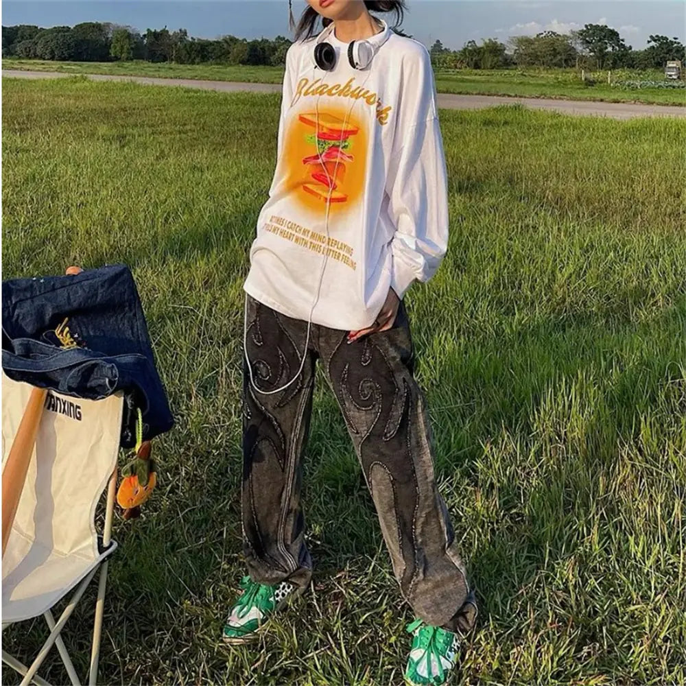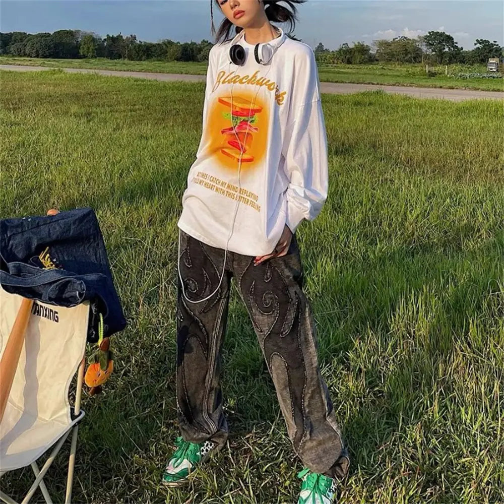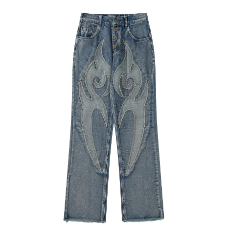 With their unique hip-hop graffiti design and washed finish, these jeans embody the essence of high street fashion. The patchwork detailing adds an edgy twist, making them a versatile choice for various occasions, be it a casual outing or a night out with friends.