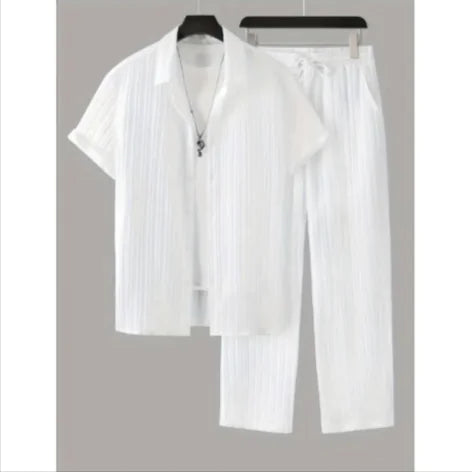 Stay cool and sharp in this men's striped short-sleeve shirt suit, perfect for summer leisure. Made from lightweight polyester, it features a button-down lapel shirt paired with matching trousers. Ideal for casual outings or vacation wear, this breathable set blends relaxed comfort with effortless style in classic solid colors.