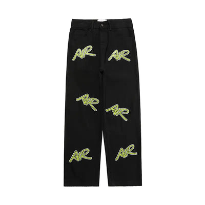 Embroidered Leather Vintage Letter Straight Leg Jeans