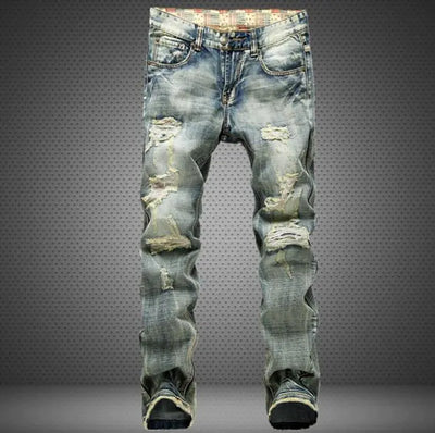 Men's Ripped Jeans with Patchwork Straight Fit Pants