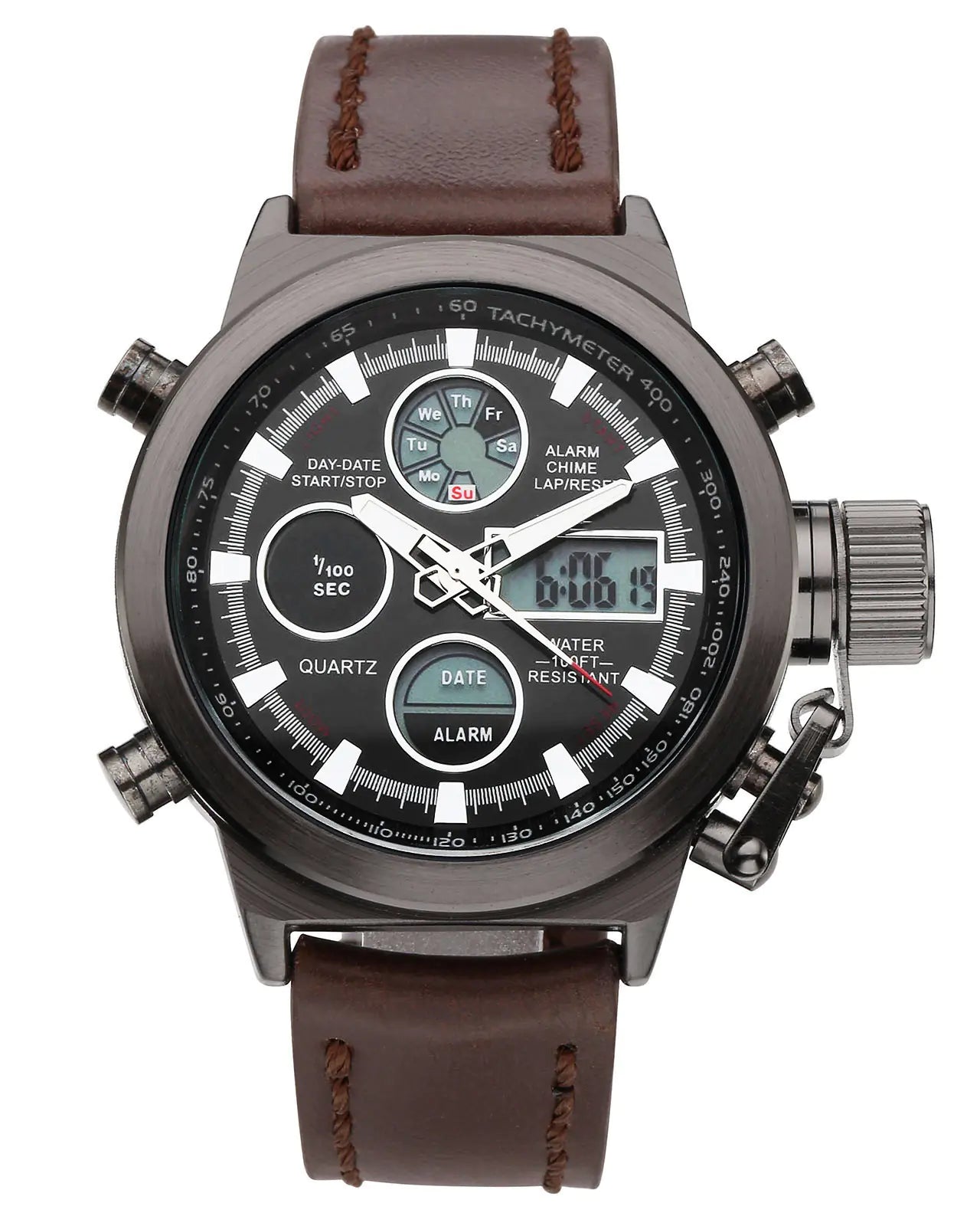 The watch has a thickness of 17mm and a dial diameter of 47mm, making it a striking accessory on your wrist. Choose between two stylish variations: a classic black shell with a black face and a sophisticated brown belt option. Both designs are complemented by a high-quality genuine leather strap and a sturdy stainless steel pin buckle.