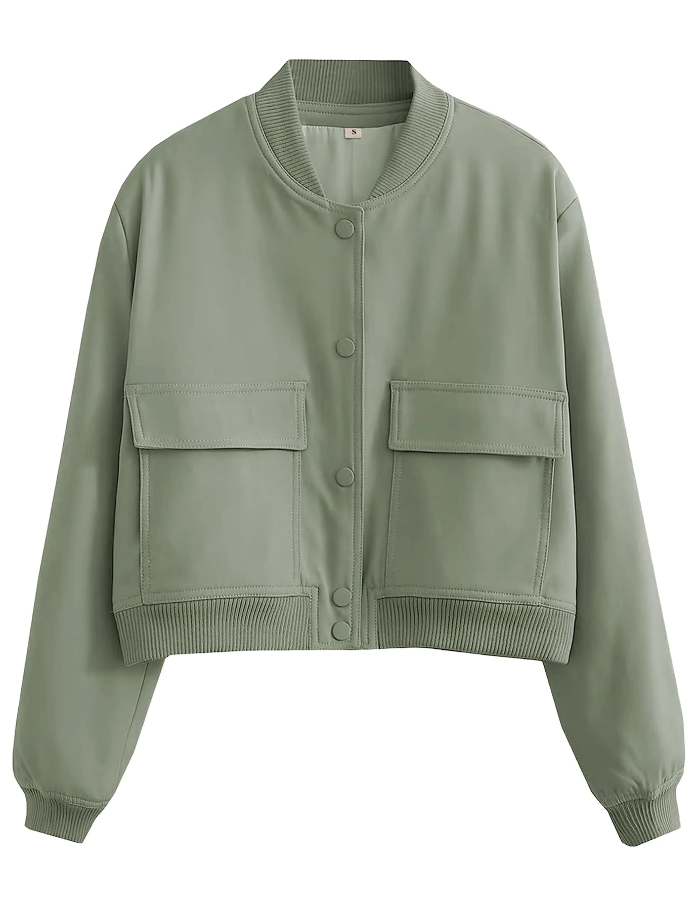 [Snap button closure "Feature: Womens casual bomber jackets with a round neck and long sleeves side pockets and two front maxi patch pockets with flaps ribbed trims and shoulder pads" "Material: The womens cropped button-down Jacket is made of high-quality fabric It has an elegant look and comfortable and lightweight wearing experience at the same time" Matching: This windbreak fashionable jacket for women is easy to pair with t-shirts blouses tops jeans dresses and sneakers "Occasions: womens stylish varsity jacket makes it perfect for spring and fall and it is a good choice for outdoor activities school casual wear holiday party and shopping"]